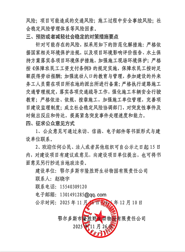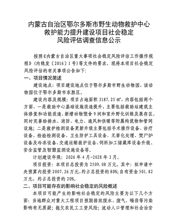 內(nèi)蒙古自治區(qū)鄂爾多斯市野生動物救護(hù)中心救護(hù)能力提升建設(shè)項(xiàng)目社會穩(wěn)定風(fēng)險評估調(diào)查信息公示